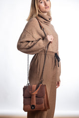 - Schulterriemen: kurzer Lederriemen; auch als Crossbody-Bag tragbar mit Goldkette und Leder am Schulterteil