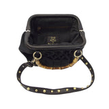 Unsere Pouchbag Amsterdam Handtasche ist ein exquisiter kleiner Begleiter. Das Obermaterial ist aus Samt und Schafsleder und gefüttert ist die Tasche mit Samt. Dazu ausgestattet mit auffälligen Tragegriffen aus Bambus.