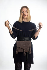 • Schulterriemen: dunkle Goldkette, am Schulterteil Leder