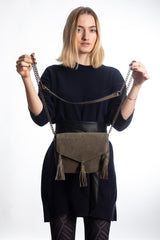 - Schulterriemen: dunkle Goldkette, am Schulterteil Leder