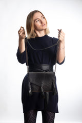 • Schulterriemen: dunkle Goldkette, am Schulterteil Leder